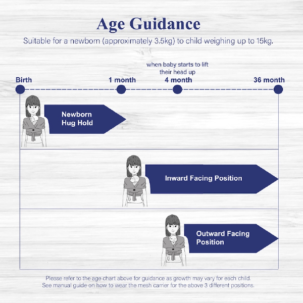 Carry baby in 3 different positions: Newborn Hug Hold, Inward Facing Position & Outward Facing Position