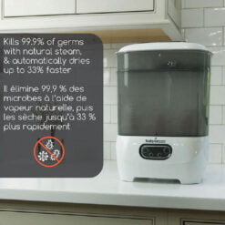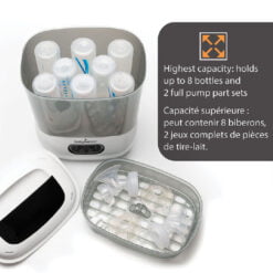 - Automatically sterilizes & dries 33% faster bottles, breast pump parts, pacifiers, teethers, sippy cups, toys & other accessories from any brand in 1 easy step, saving you time.