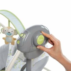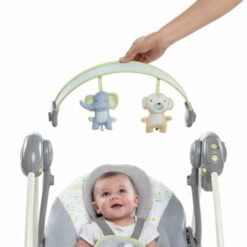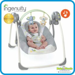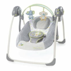 This handy portable swing goes everywhere you go! Ingenuity’s Soothe ‘n Delight Portable Swing in the Buzzy Bloom fashion will keep baby happy and comfortable, even on the go. The ComfortRecline™ seat keeps baby content with two recline seat positions. TrueSpeed™ technology maintains six consistent speeds, even as baby gains and grows. Your little one will enjoy six peaceful melodies along with volume control and auto shutoff. The toy bar offers two plush toys and removes easily for better access to baby. The swing timer has three settings15, 30 and 45 minutes, and WhisperQuiet™ operation means baby will swing undisturbed by any swing noise. The seat pad and head support are easy to clean. Five-point harness and non-slip feet for safety.