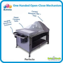 Bubbles premium playards/playpens are designed with parents convenience in mind. It comes with a diaper changing table, curved canopy with curved mosquito netting and hanging toys. It is easy to open and stores compactly in a travel bag. Enjoy added convenience with an attachable toys to keep the baby entertained.