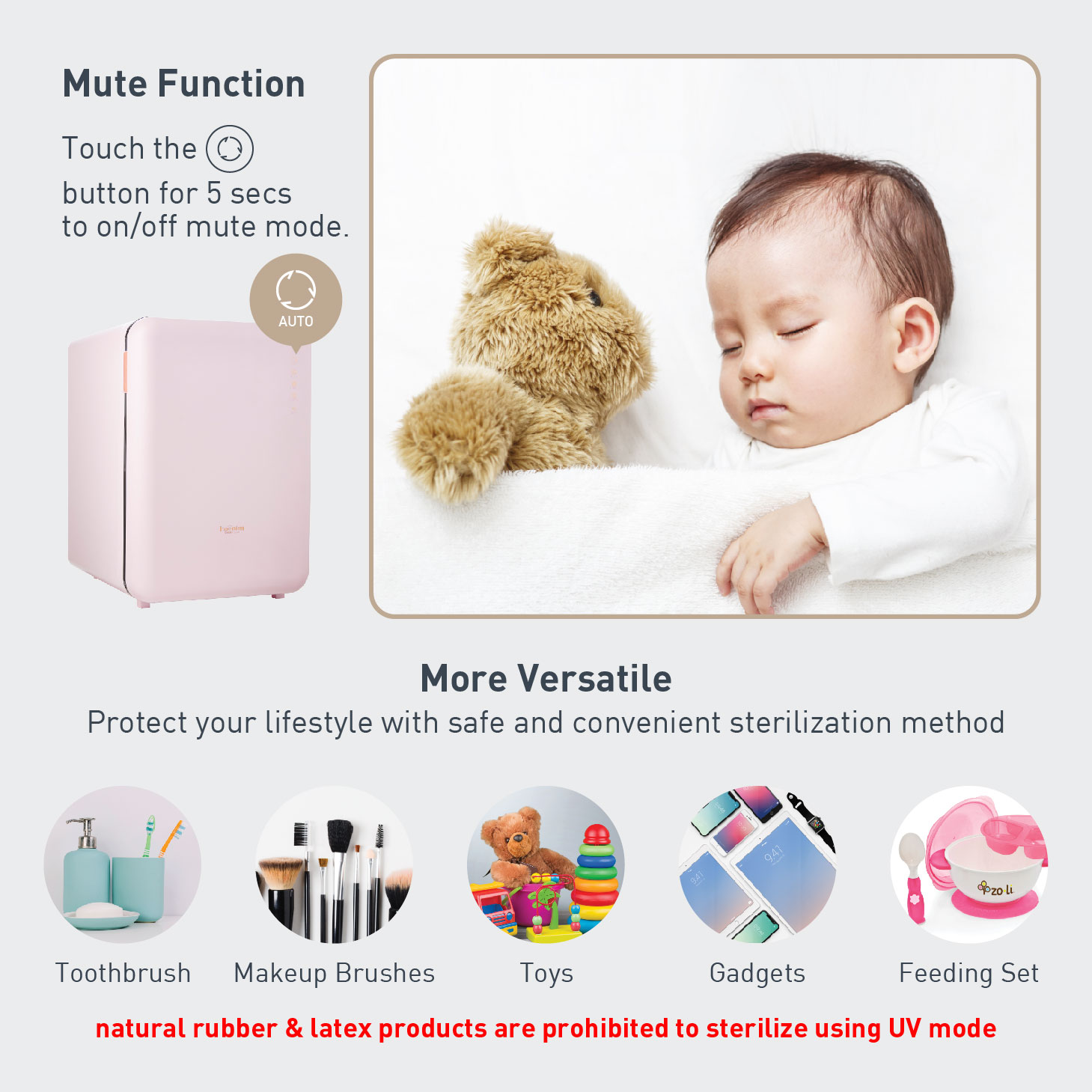 Items turn yellowish much slower compared to sterilizing with UV Lamp.
