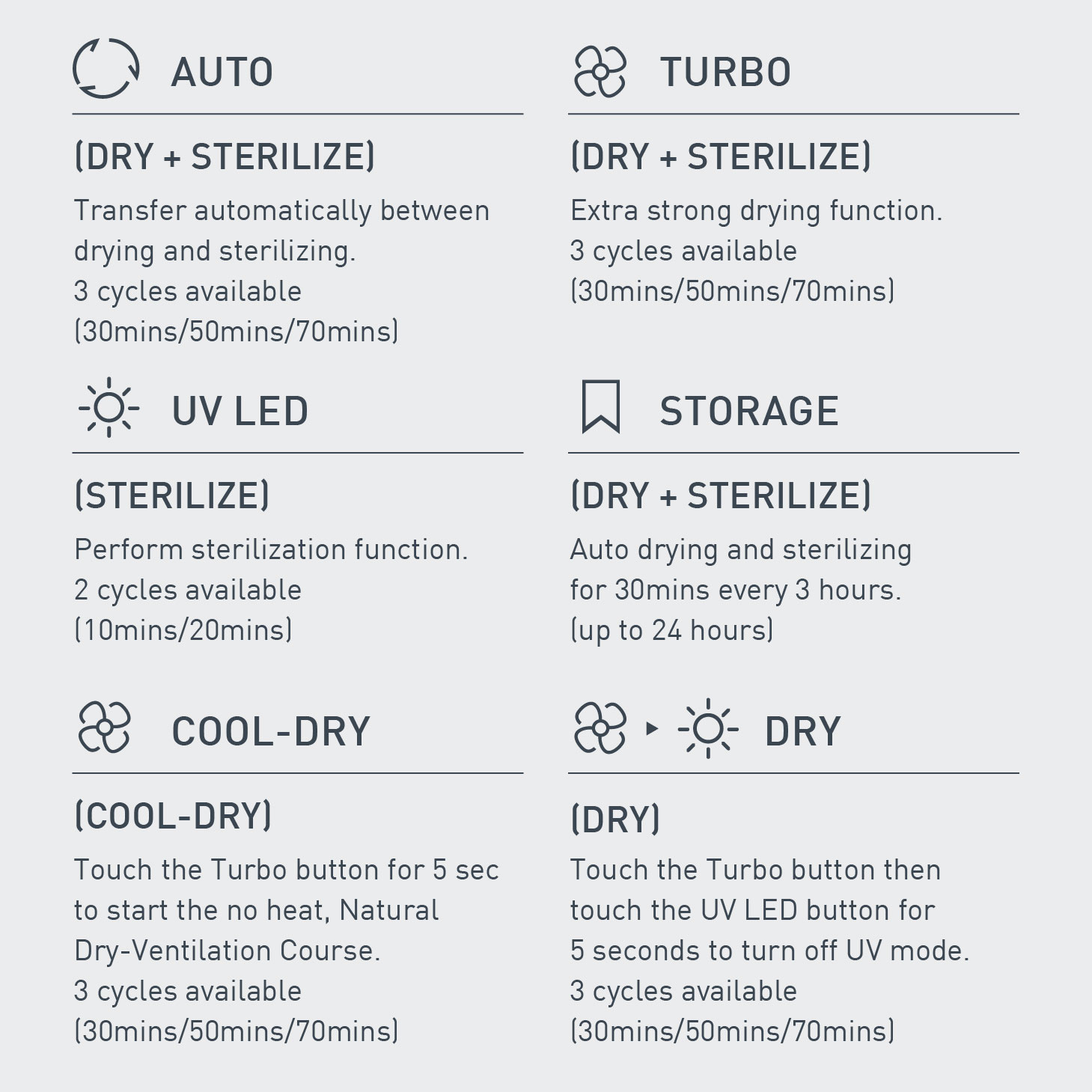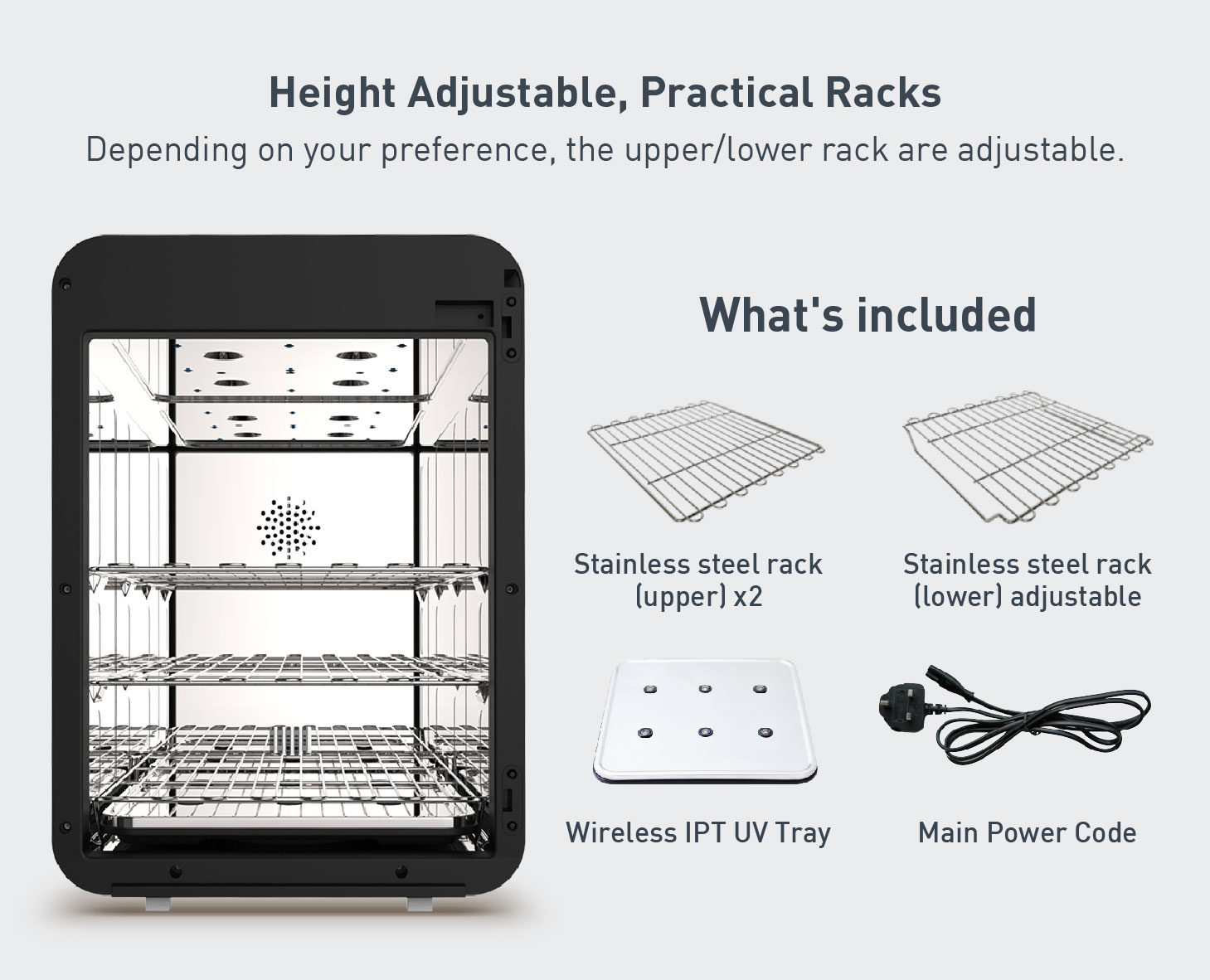 Main 7 functions: Auto, Dry, Turbo, Cool Dry, UV LED, Storage & Clean alert, additionally with UVC-LED malfunction sensor, 1x wireless UV Tray, and 3x racks.