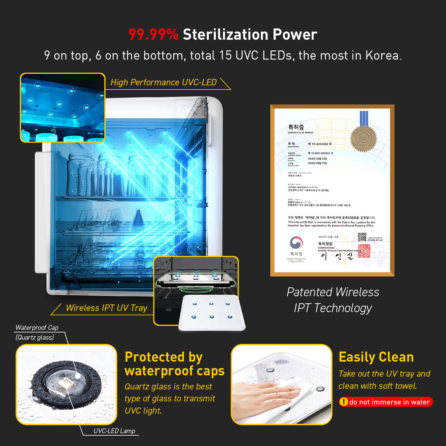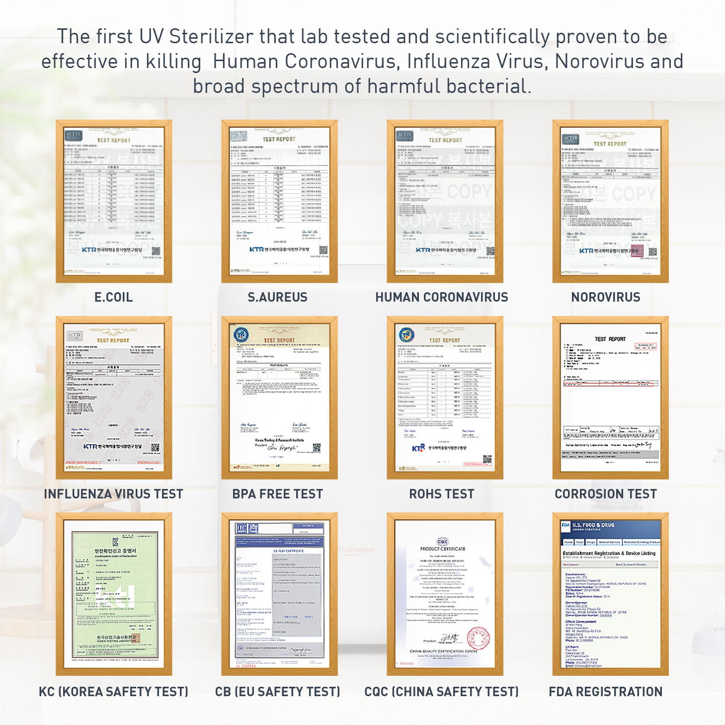 Eliminate 99.99% percent harmful viruses and bacteria, efficiency tested and certified by laboratory in KOREA, JAPAN and FDA Registered.
