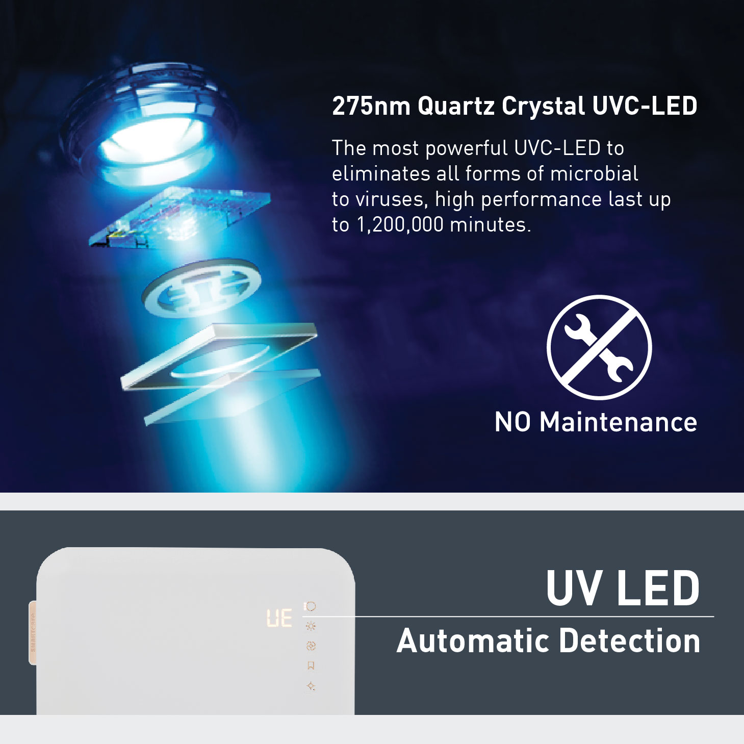 One+One (1+1) Years Warranty; Five (5) Years Warranty for LED; One (1) Year Warranty for wireless UV-Tray.