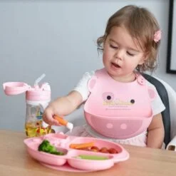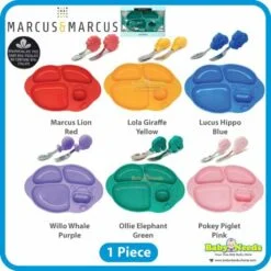 Marcus & Marcus Toddler Dining Set includes a Yummy Dips Suction Divided Plate and a set of Palm Grasp Spoon & Fork.