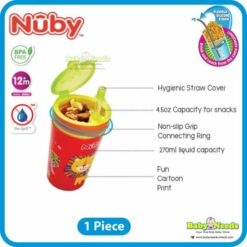 Nuby Snack N’ Sip Cup 12m+ (270ml/9oz) Nûby’s new Snack N’ Sip™ range of cups allows your child to eat and drink from the same container! This revolutionary design is made for the parent on-the-go and is great for day picnics, hikes, and your child’s recreational activities! The soft silicone straw is uniquely designed to prevent drips and spills while being delicate and gentle to gums and teeth. All Nûby™ products are made of safe, durable, materials and exceed all government safety regulations and standards.