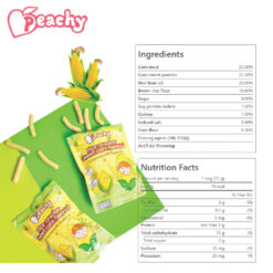 – Corn Meal, Corn Sweet Powder, Rice Bran Oil, Brown Rice Flour, Sugar, Soy Protein Isolate, Quinoa, Lodized Salt, Corn Flour, Firming agent (INS 170(i)), Artificial Flavoring
