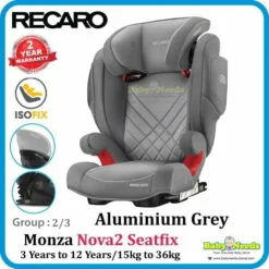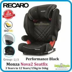 “GOOD” StiWa test result with 2.0 . Maximum side impact protection Optimal protection even for older children Depth adjustable headrest provides secure position of the head in between the side protectors – even during sleep Reinforced armrests for optimal support in the hip area SEATFIX connection means the Monza Nova 2 Seatfix secures to your vehicle’s ISOFIX points providing additional stability Also available without Seatfix Comfortable seating foam adapts perfectly to the body shape and provides necessary support Air Circulation SystemVentilation system ensures comfort even on warm days Eleven way height adjustable headrest The integrated RECARO Sound System with MP3 connection means that your child can enjoy their own audio without disturbing anybody else in the car. The integrated speakers encouraging him or her to keep their head in the protective headrest area.