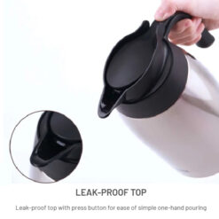 - Leak-proof top opens with push button ease for simple one-handed pouring.