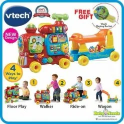 VTech Sit-to-Stand Push and Ride Alphabet Train Make tracks with the Push and Ride Alphabet Train, teaching toddlers’ letters, numbers, colours, songs, stories and more! The Push and Ride Alphabet Train features 26 double-side letter blocks, a book with six turning pages, five colourful number buttons, one movable elephant character, a motion sensor, a ride-on carriage and a drop-space for sending the blocks from the train to the carriage. Use alone for floor play, push along as a walker, or attach to the carriage as a ride-on toy!